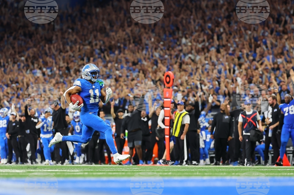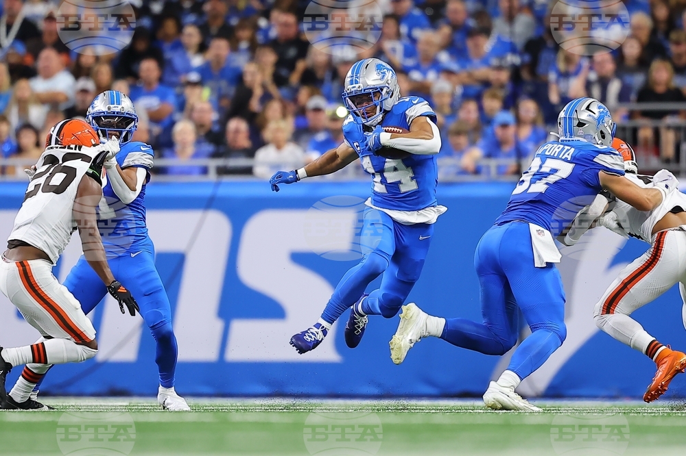 Detroit Lions wide receiver Amon-Ra St. Brown (14) runs during the first half of an NFL football game against the Cleveland Browns, Sunday, Sept. 28, 2025, in Detroit. (AP Photo/Rey Del Rio)