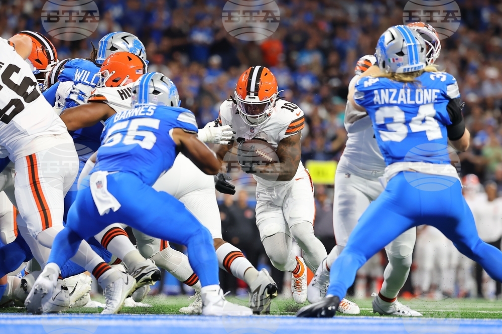 Cleveland Browns' Quinshon Judkins runs during the second half of an NFL football game against the Detroit Lions, Sunday, Sept. 28, 2025, in Detroit. (AP Photo/Rey Del Rio)
