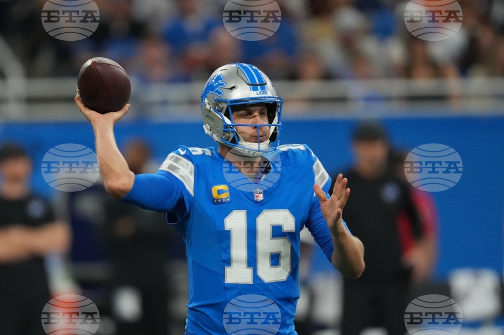 Detroit Lions quarterback Jared Goff (16) throws during the first half of an NFL football game against the Cleveland Browns, Sunday, Sept. 28, 2025, in Detroit. (AP Photo/Paul Sancya)