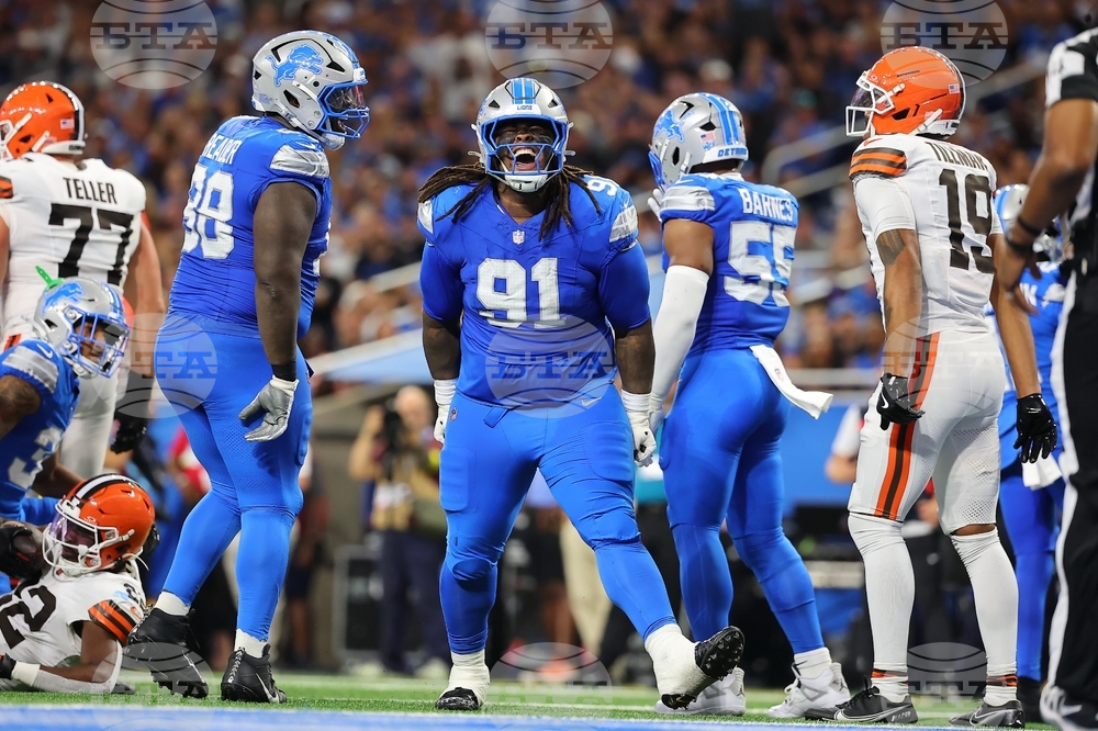 Detroit Lions defensive tackle Tyleik Williams (91) reacts during the first half of an NFL football game against the Cleveland Browns, Sunday, Sept. 28, 2025, in Detroit. (AP Photo/Rey Del Rio)