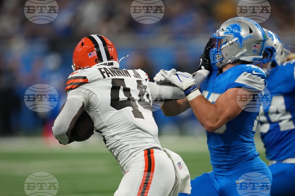Cleveland Browns tight end Harold Fannin Jr. (44) is tackled by Detroit Lions linebacker Jack Campbell (46) during the first half of an NFL football game, Sunday, Sept. 28, 2025, in Detroit. (AP Photo/Paul Sancya)