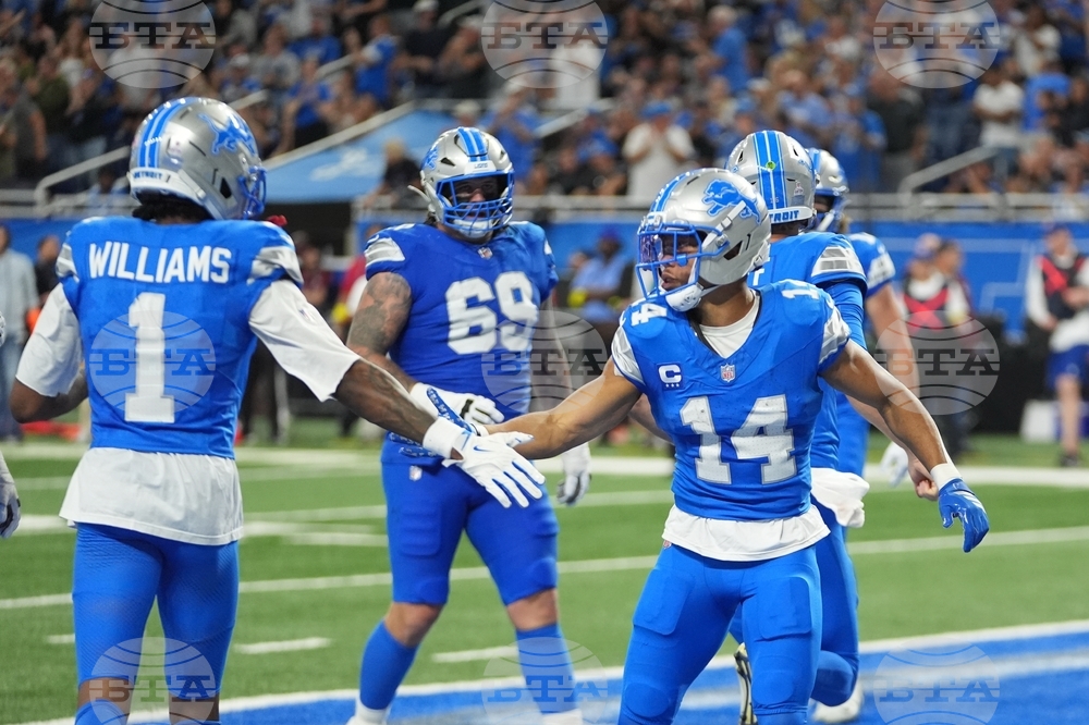 Detroit Lions wide receiver Amon-Ra St. Brown (14) reacts after a touchdown during the second half of an NFL football game against the Cleveland Browns, Sunday, Sept. 28, 2025, in Detroit. (AP Photo/Paul Sancya)