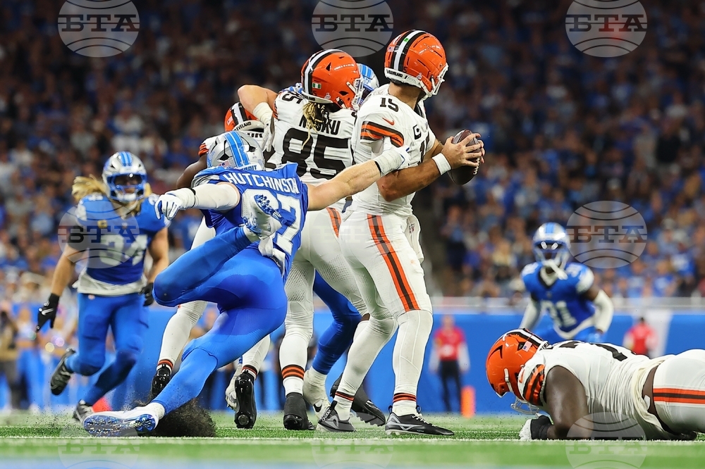 Detroit Lions defensive end Aidan Hutchinson (97) sacks Cleveland Browns quarterback Joe Flacco (15) during the first half of an NFL football game, Sunday, Sept. 28, 2025, in Detroit. (AP Photo/Paul Sancya)