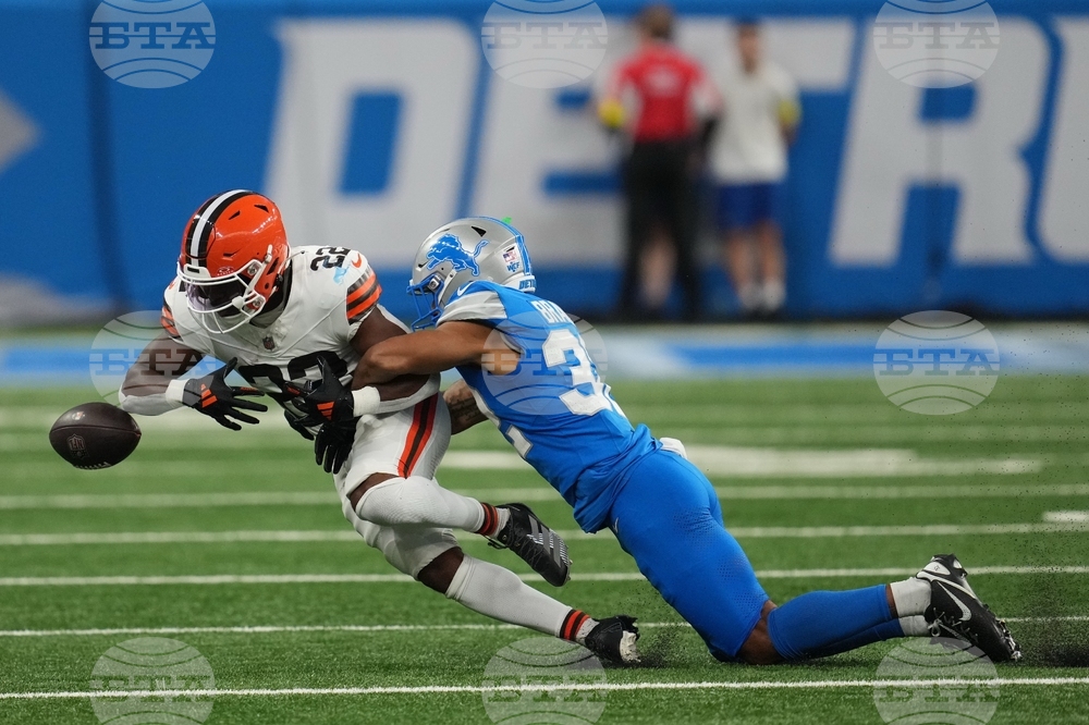 Detroit Lions safety Brian Branch (32) breaks up a pass intended for Cleveland Browns running back Dylan Sampson (22) during the second half of an NFL football game, Sunday, Sept. 28, 2025, in Detroit. (AP Photo/Paul Sancya)