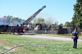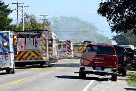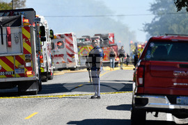 Fire department personnel stand along McCandlish Road near a shooting that took place at The Church of Jesus Christ of Latter-day Saints, Sunday, Sept. 28, 2025, in Grand Blanc, Mich. (AP Photo/Jose Juarez)