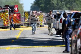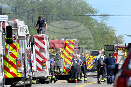 Law enforcement and fire personnel stand near the corner of McCandlish and Holly road, near a shooting that took place at The Church of Jesus Christ of Latter-day Saints, Sunday, Sept. 28, 2025, in Grand Blanc, Mich. (AP Photo/Jose Juarez)