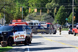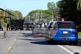 Law enforcement guard the area along McCandlish Road near a shooting that took place at The Church of Jesus Christ of Latter-day Saints, Sunday, Sept. 28, 2025, in Grand Blanc, Mich. (AP Photo/Jose Juarez)