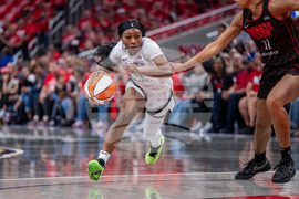 Las Vegas Aces guard Jackie Young (0) drives the ball around the defense of Indiana Fever guard Odyssey Sims, right, during the first half of Game 4 of a WNBA basketball playoff semifinals series in Indianapolis, Sunday, Sept. 28, 2025. (AP Photo/Doug McSchooler)