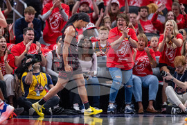 Indiana Fever guard Lexie Hull reacts after scoring during the first half of Game 4 of a WNBA basketball playoff semifinals series against the Las Vegas Aces in Indianapolis, Sunday, Sept. 28, 2025. (AP Photo/Doug McSchooler)