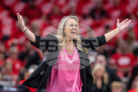 Las Vegas Aces head coach Becky Hammon reacts during the first half of Game 4 of a WNBA basketball playoff semifinals series against the Indiana Fever in Indianapolis, Sunday, Sept. 28, 2025. (AP Photo/Doug McSchooler)