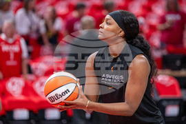 Las Vegas Aces forward NaLyssa Smith (3) warms up on the court before Game 4 of a WNBA basketball playoff semifinals series against the Indiana Fever in Indianapolis, Sunday, Sept. 28, 2025. (AP Photo/Doug McSchooler)