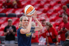 Indiana Fever guard Lexie Hull warms up on the court before Game 4 of a WNBA basketball playoff semifinals series against the Las Vegas Aces in Indianapolis, Sunday, Sept. 28, 2025. (AP Photo/Doug McSchooler)