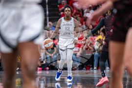 Las Vegas Aces guard Chelsea Gray (12) brings the ball upcourt during the first half of Game 4 of a WNBA basketball playoff semifinals series against the Indiana Fever in Indianapolis, Sunday, Sept. 28, 2025. (AP Photo/Doug McSchooler)