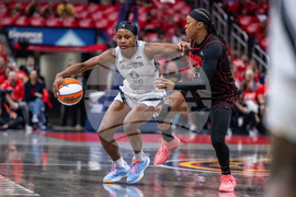 Indiana Fever guard Kelsey Mitchell (0) goes up to shoot while defended by Las Vegas Aces guard Jewell Loyd (24) during the second half of Game 4 of a WNBA basketball playoff semifinals series in Indianapolis, Sunday, Sept. 28, 2025. (AP Photo/Doug McSchooler)