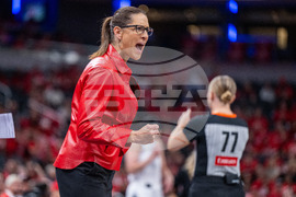 Indiana Fever head coach Stephanie White reacts during the second half of Game 4 of a WNBA basketball playoff semifinals series against the Las Vegas Aces in Indianapolis, Sunday, Sept. 28, 2025. (AP Photo/Doug McSchooler)