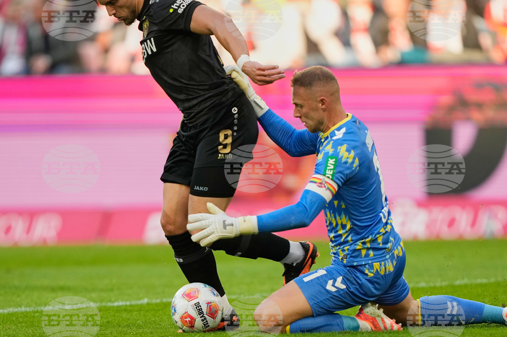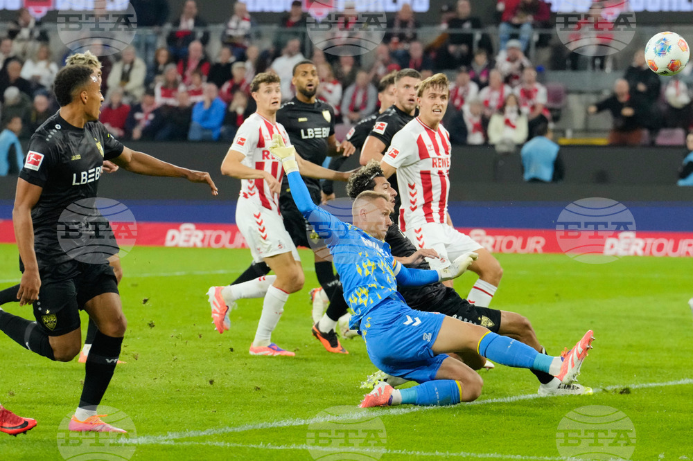 Cologne's goalkeeper Marvin Schwaebe misses to score in the last minute in front of Stuttgart's goal during the German Bundesliga soccer match between 1.FC Köln and VfB Stuttgart in Cologne, Germany, Sunday, Sept. 28, 2025. (AP Photo/Martin Meissner)