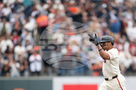 San Francisco Giants' Jung Hoo Lee runs to home plate during the eighth inning of a baseball game against the Colorado Rockies, Sunday, Sept. 28, 2025, in San Francisco. (AP Photo/Thien-An Truong)