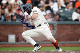 San Francisco Giants' Willy Adames dodges a pitch during the fifth inning of a baseball game against the Colorado Rockies, Sunday, Sept. 28, 2025, in San Francisco. (AP Photo/Thien-An Truong)