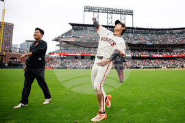 San Francisco Giants' Jung Hoo Lee, right, throws baseballs to fans after a baseball game against the Colorado Rockies, Sunday, Sept. 28, 2025, in San Francisco. (AP Photo/Thien-An Truong)
