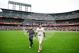 San Francisco Giants' Jung Hoo Lee, right, walks on the field after a baseball game against the Colorado Rockies, Sunday, Sept. 28, 2025, in San Francisco. (AP Photo/Thien-An Truong)