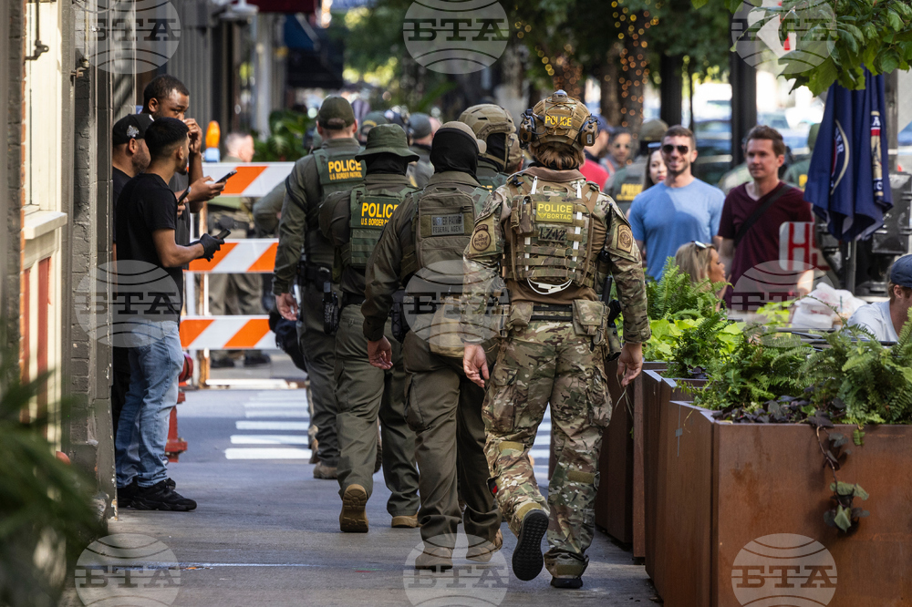 Federal agents from U.S. Immigration and Customs Enforcement and U.S. Customs and Border Protection walk along West Wacker Drive in the Loop, Sunday, Sept. 28, 2025, in Chicago. (Ashlee Rezin/Chicago Sun-Times via AP)