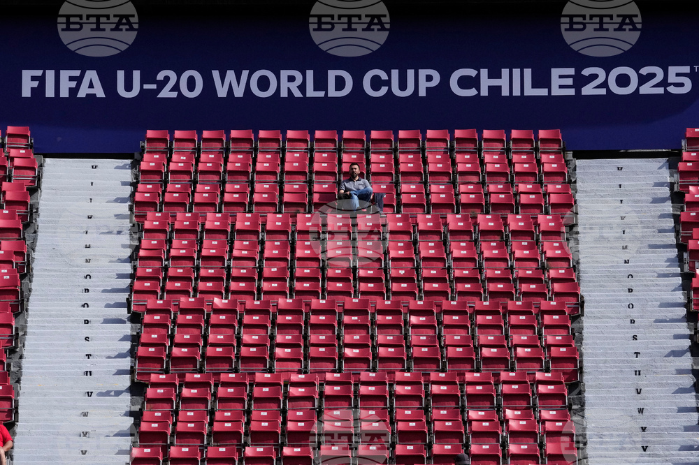 A fan waits for the start of a FIFA U-20 World Cup Group C soccer match between Morocco and Spain at National Stadium in Santiago, Chile, Sunday, Sept. 28, 2025. (AP Photo/Matias Delacroix)