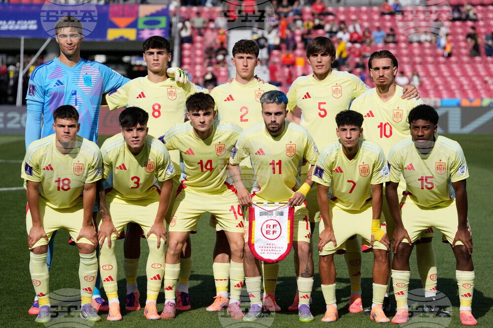 Players of Spain pose for a team photo prior to a FIFA U-20 World Cup Group C soccer match against Morocco at National Stadium in Santiago, Chile, Sunday, Sept. 28, 2025. (AP Photo/Matias Delacroix)