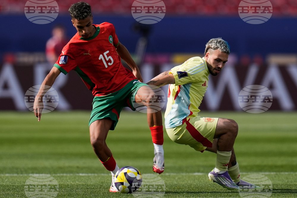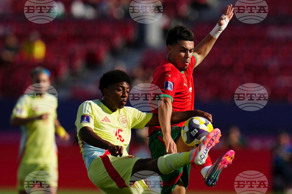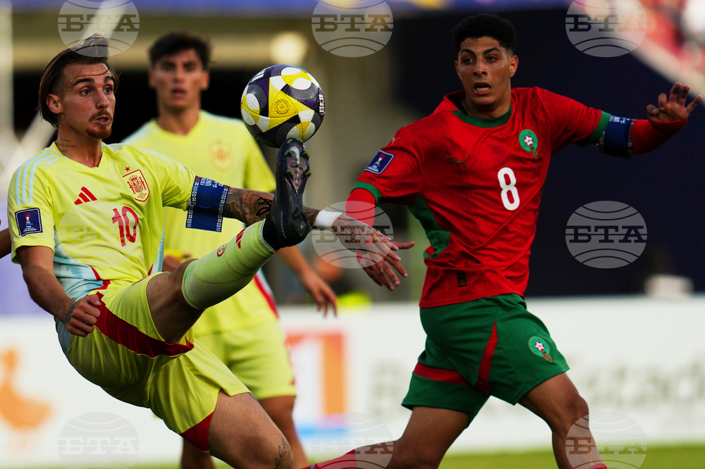 Morocco's Smail Bakhty, front, and Spain's Jan Virgili battle for the ball during a FIFA U-20 World Cup Group C soccer match at National Stadium in Santiago, Chile, Sunday, Sept. 28, 2025. (AP Photo/Matias Delacroix)