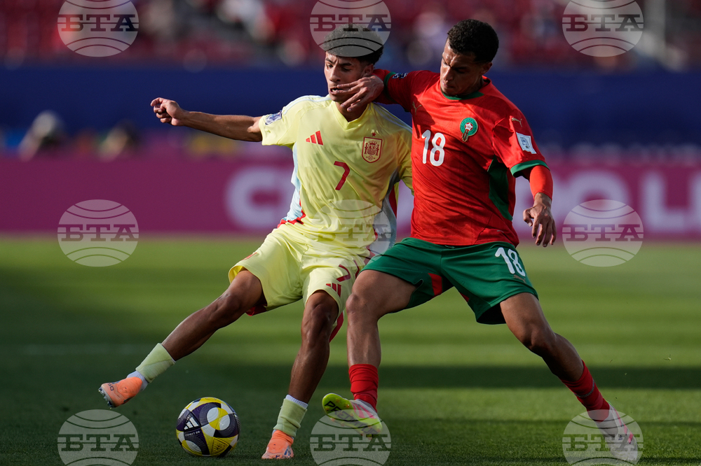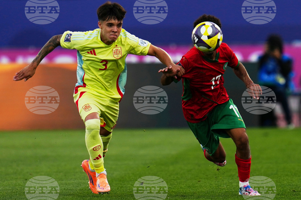 Spain's Iker Bravo, right, and Morocco's Ismael Baouf battle for the ball during a FIFA U-20 World Cup Group C soccer match at National Stadium in Santiago, Chile, Sunday, Sept. 28, 2025. (AP Photo/Esteban Felix)