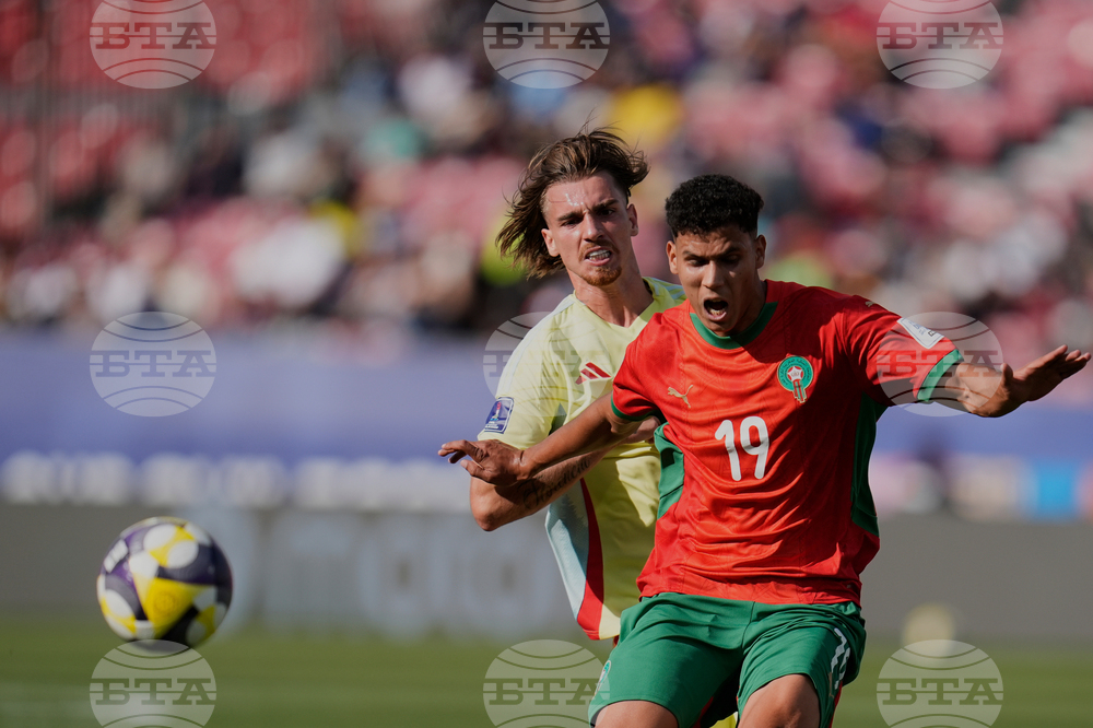 Spain's David Cristian, left, and Morocco's Othmane Maamma battle for the ball during a FIFA U-20 World Cup Group C soccer match at National Stadium in Santiago, Chile, Sunday, Sept. 28, 2025. (AP Photo/Esteban Felix)