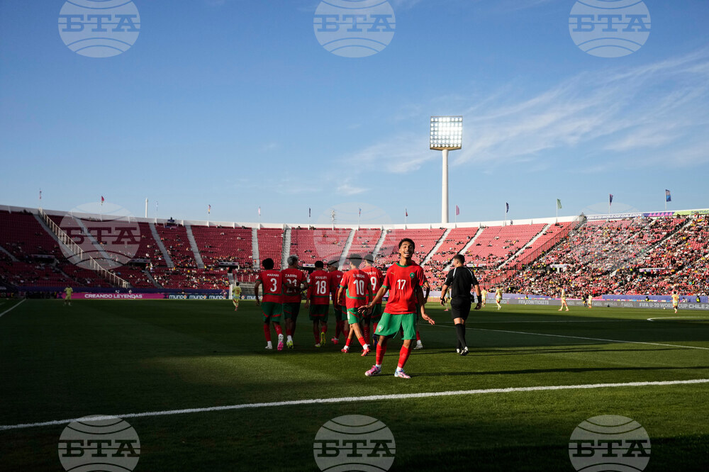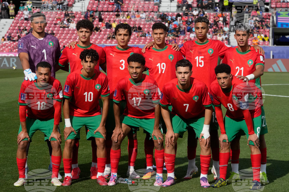 Players of Morocco pose for a team photo prior to during a FIFA U-20 World Cup Group C soccer match against Spain at National Stadium in Santiago, Chile, Sunday, Sept. 28, 2025. (AP Photo/Esteban Felix)
