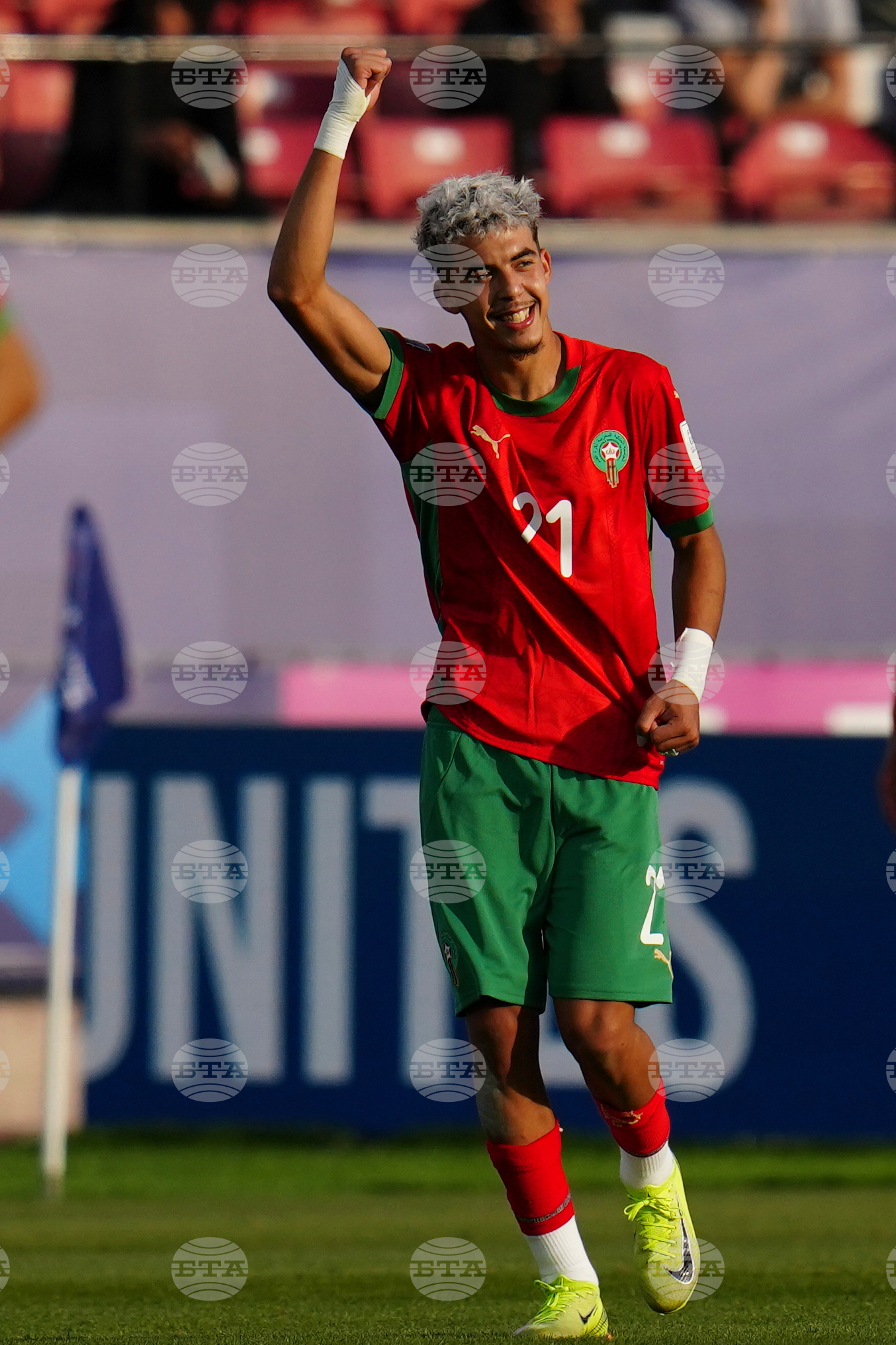 Morocco's Gessime Yassine (17) celebrates scoring his side's second goal against Spain during a FIFA U-20 World Cup Group C soccer match at National Stadium in Santiago, Chile, Sunday, Sept. 28, 2025. (AP Photo/Matias Delacroix)