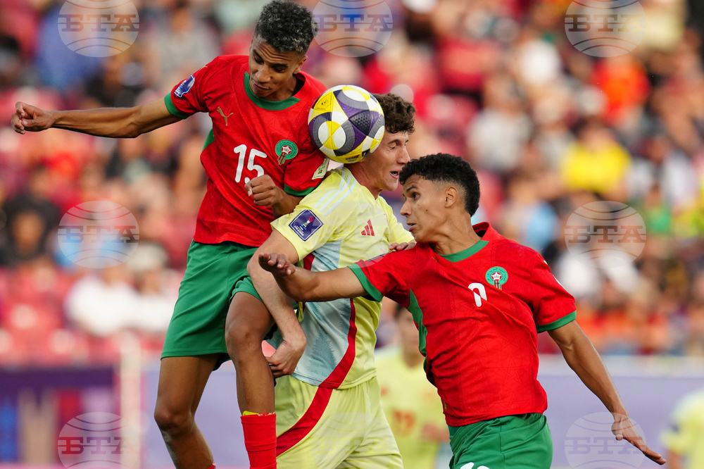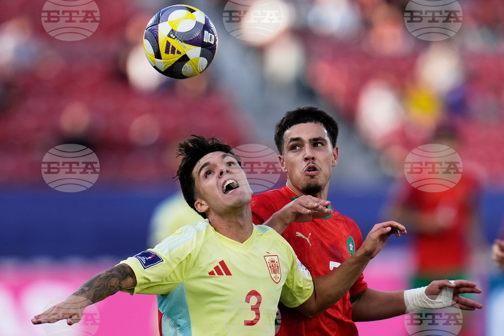 Spain's Julio Diaz (3) and Morocco's Othmane Maamma view the ball during a FIFA U-20 World Cup Group C soccer match at National Stadium in Santiago, Chile, Sunday, Sept. 28, 2025. (AP Photo/Matias Delacroix)