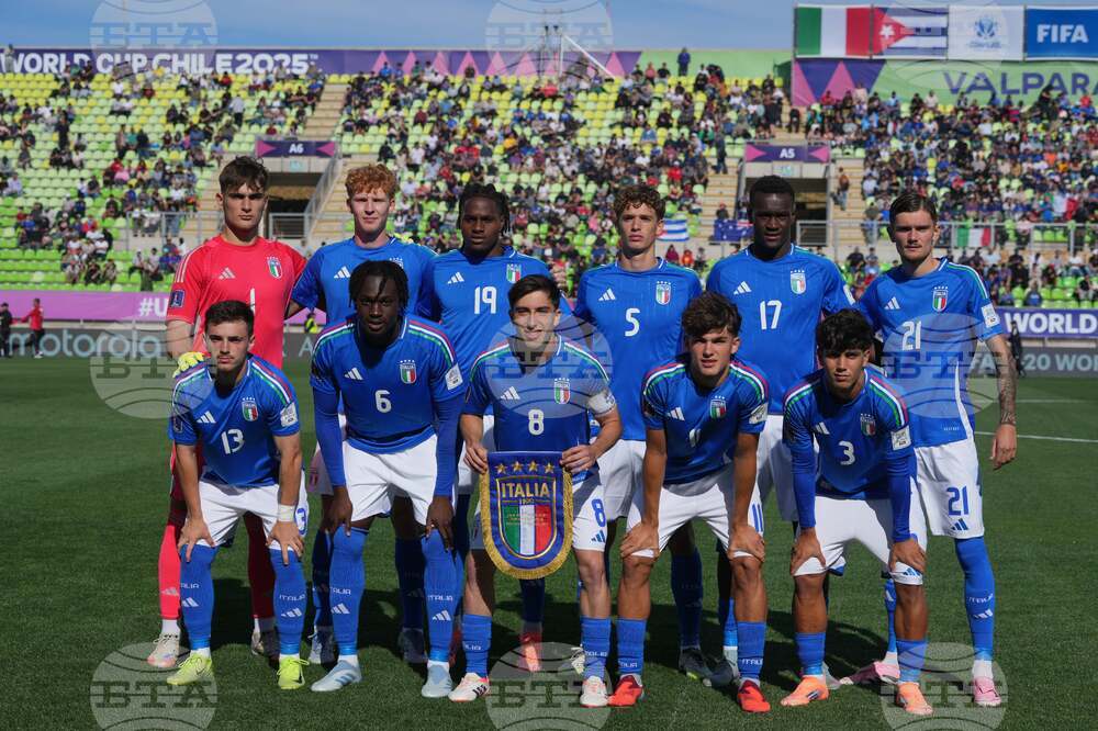 Italy's starting players pose for a team photo prior to the FIFA U-20 World Cup Group D soccer match against Australia at Elias Figueroa Brander Stadium in Valparaiso, Chile, Sunday, Sept. 28, 2025. (AP Photo/Andre Penner)