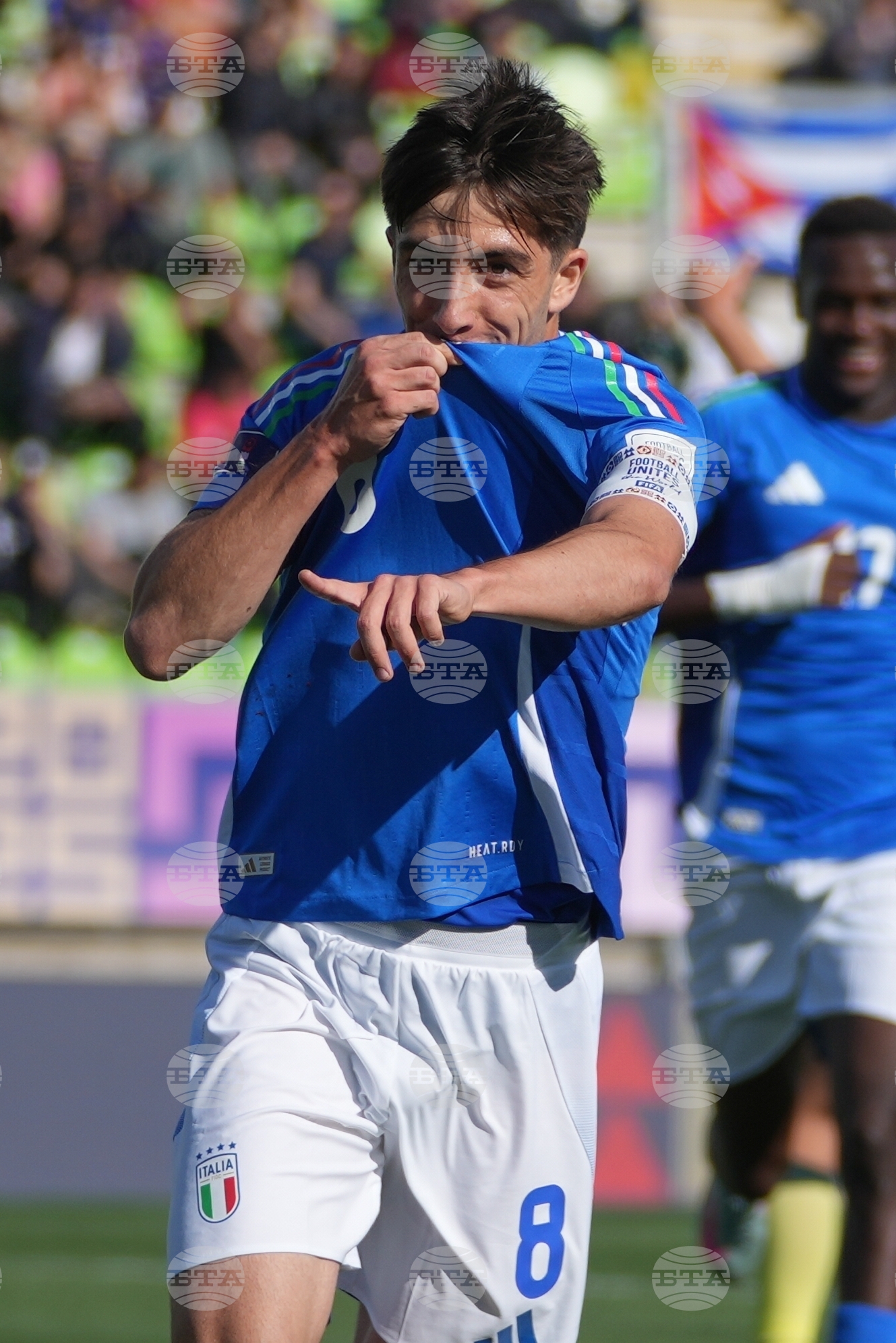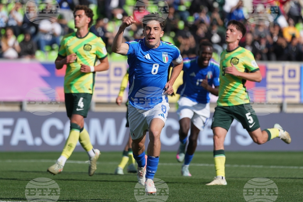 Italy's Mattia Mannini celebrates after scoring his side's second goal against Australia during a FIFA U-20 World Cup Group D soccer match at Elias Figueroa Brander Stadium in Valparaiso, Chile, Sunday, Sept. 28, 2025. (AP Photo/Andre Penner)
