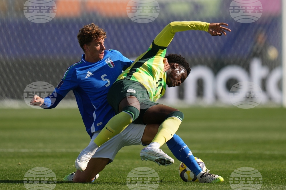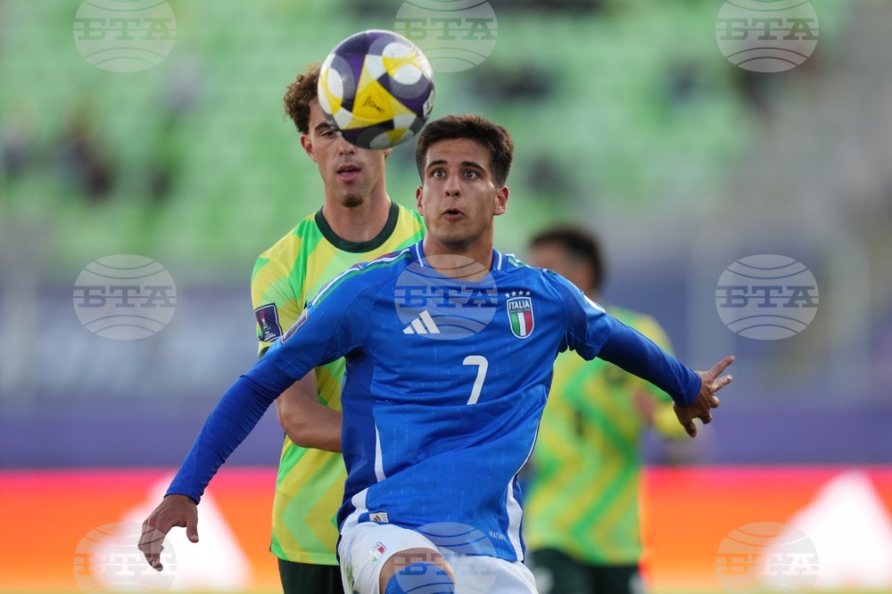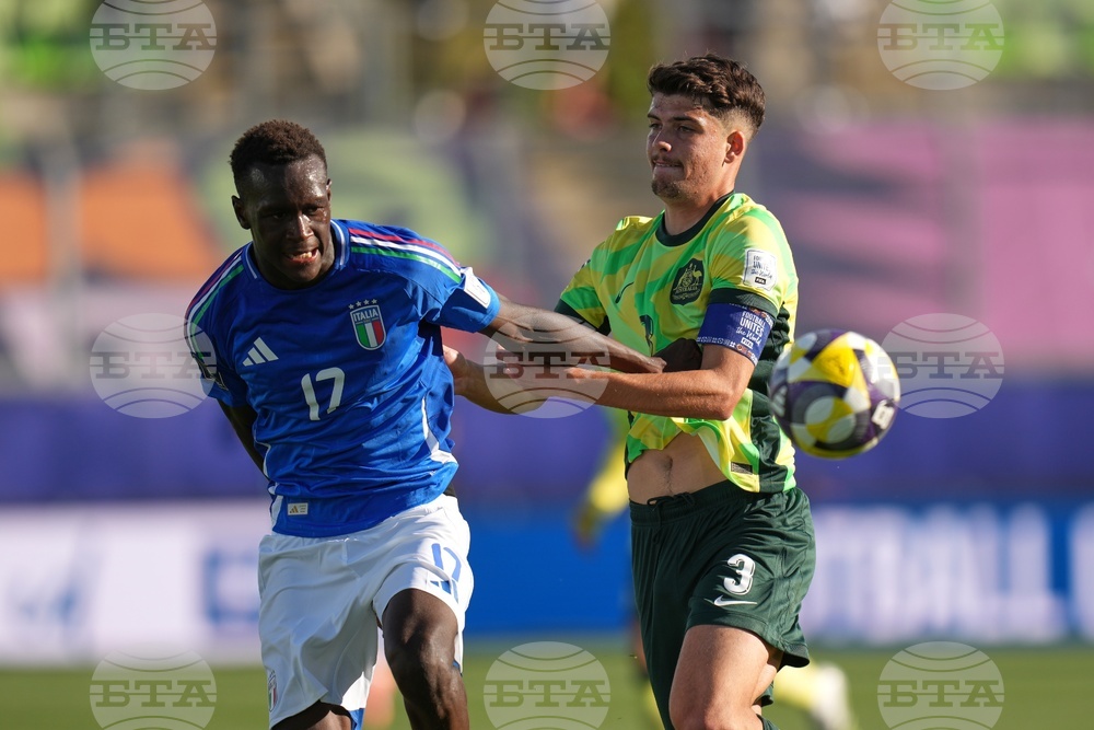 Italy's Jamal Iddrissou, let, and Australia's Sebastian Esposito battle for the ball during a FIFA U-20 World Cup Group D soccer match at Elias Figueroa Brander Stadium in Valparaiso, Chile, Sunday, Sept. 28, 2025. (AP Photo/Andre Penner)