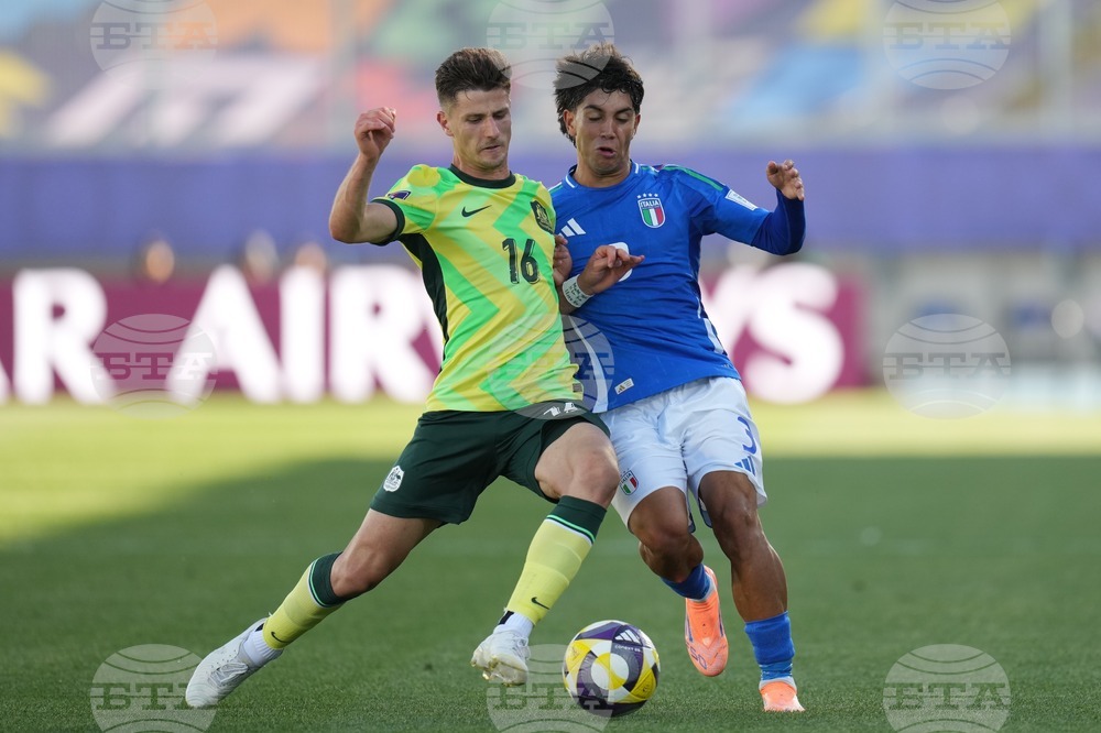 Italy's Andrea Natali, let, and Australia's Musa Toure battle for the ball during a FIFA U-20 World Cup Group D soccer match at Elias Figueroa Brander Stadium in Valparaiso, Chile, Sunday, Sept. 28, 2025. (AP Photo/Andre Penner)