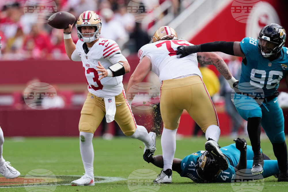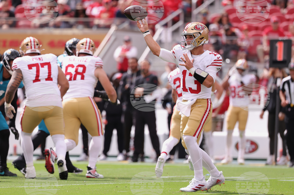 San Francisco 49ers quarterback Brock Purdy (13) passes against the Jacksonville Jaguars during the first half of an NFL football game in Santa Clara, Calif., Sunday, Sept. 28, 2025. (AP Photo/Kelley L. Cox)