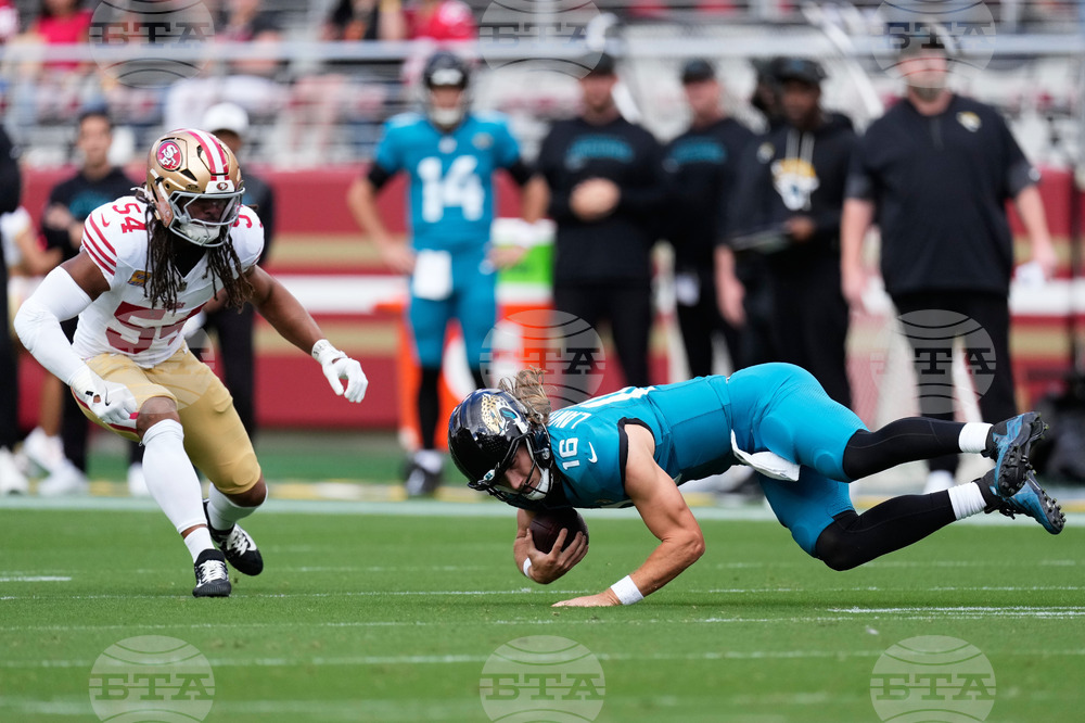 Jacksonville Jaguars quarterback Trevor Lawrence (16) dives forward in front of San Francisco 49ers middle linebacker Fred Warner (54) during the first half of an NFL football game in Santa Clara, Calif., Sunday, Sept. 28, 2025. (AP Photo/Godofredo A. Vásquez)