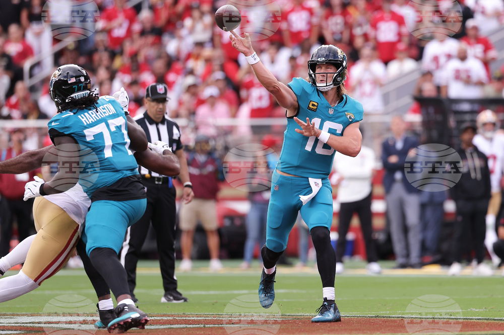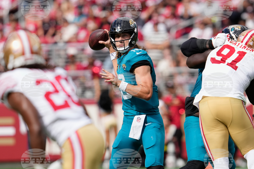 Jacksonville Jaguars quarterback Trevor Lawrence (16) passes against the San Francisco 49ers during the first half of an NFL football game in Santa Clara, Calif., Sunday, Sept. 28, 2025. (AP Photo/Godofredo A. Vásquez)