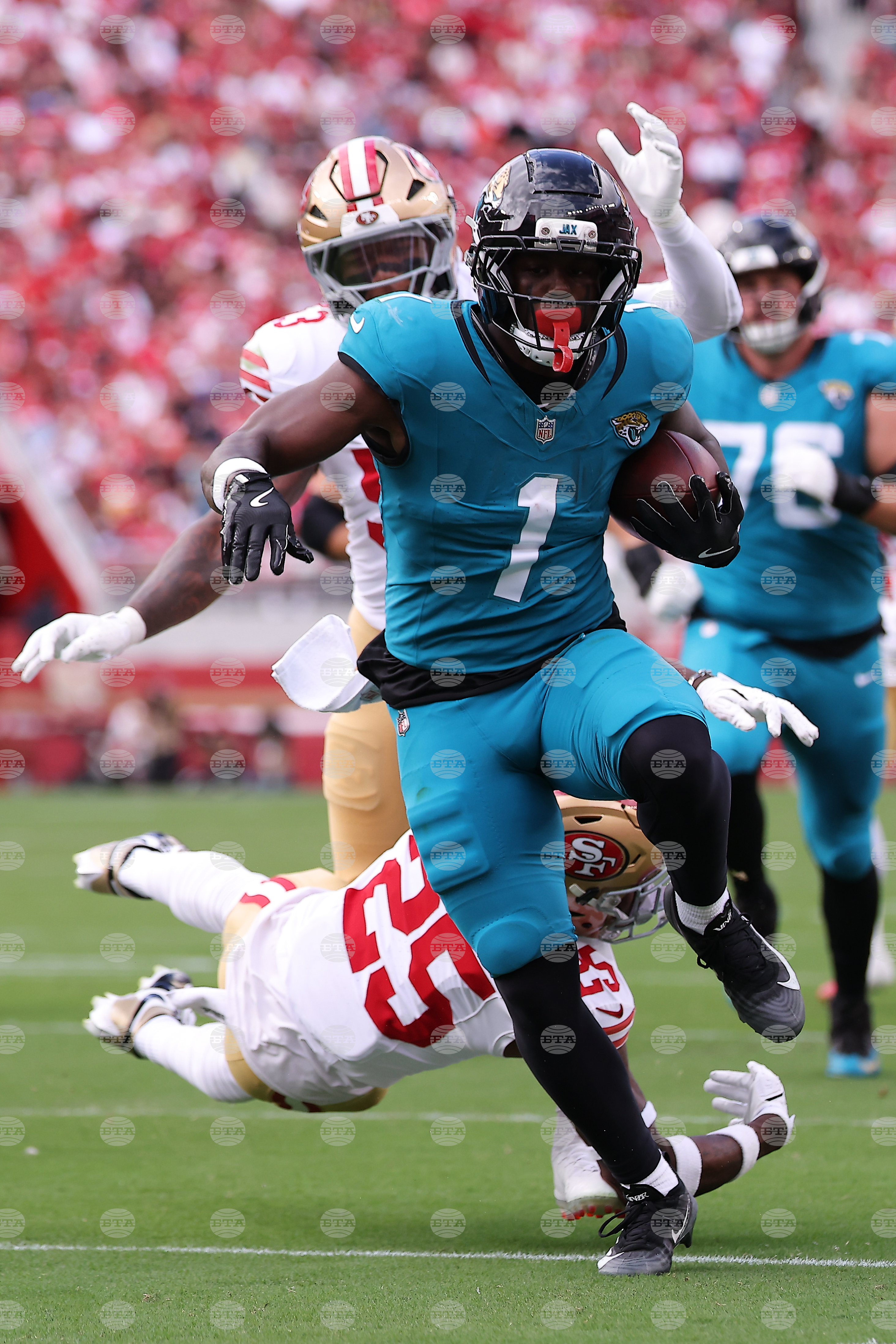Jacksonville Jaguars running back Bhayshul Tuten (33) runs against the San Francisco 49ers during the first half of an NFL football game in Santa Clara, Calif., Sunday, Sept. 28, 2025. (AP Photo/Godofredo A. Vásquez)