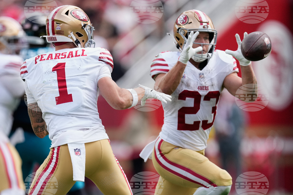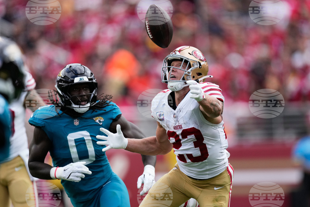 San Francisco 49ers running back Christian McCaffrey (23) cannot catch a pass, which was intercepted by Jacksonville Jaguars linebacker Devin Lloyd (0), during the first half of an NFL football game in Santa Clara, Calif., Sunday, Sept. 28, 2025. (AP Photo/Godofredo A. Vásquez)