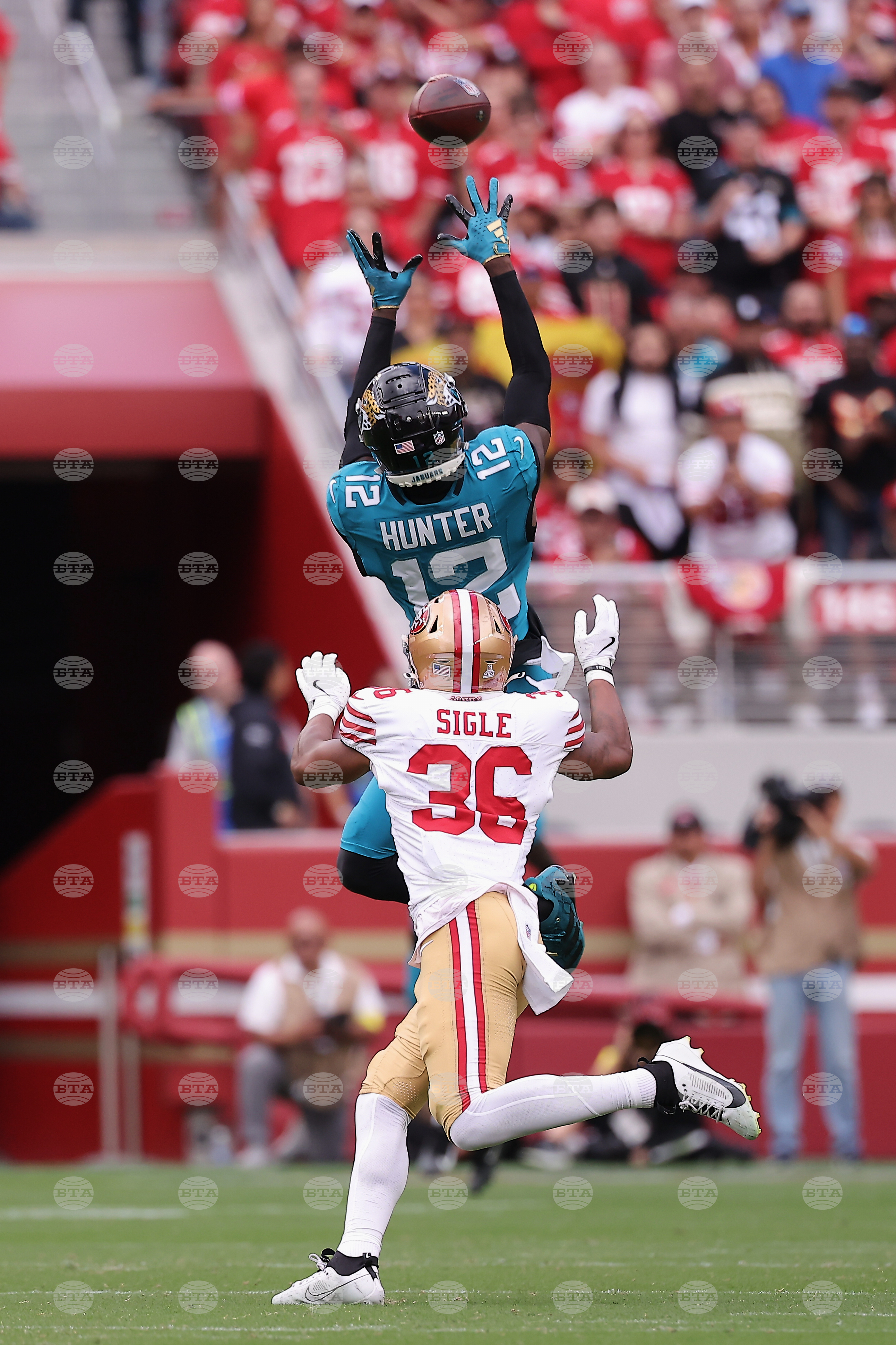 Jacksonville Jaguars wide receiver Travis Hunter (12) catches a pass against San Francisco 49ers safety Marques Sigle (36) during the first half of an NFL football game in Santa Clara, Calif., Sunday, Sept. 28, 2025. (AP Photo/Kelley L. Cox)
