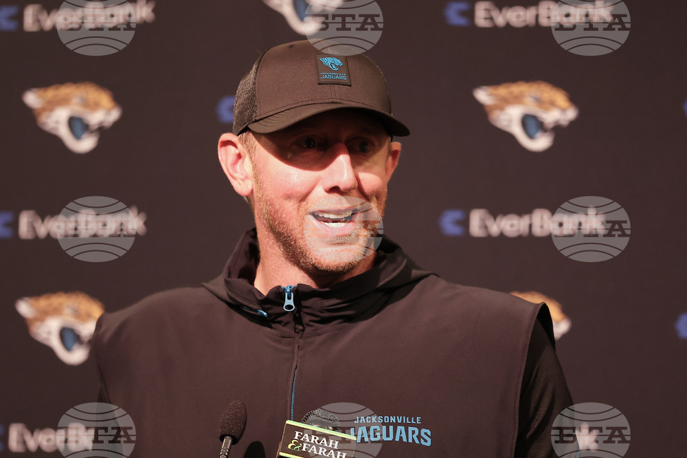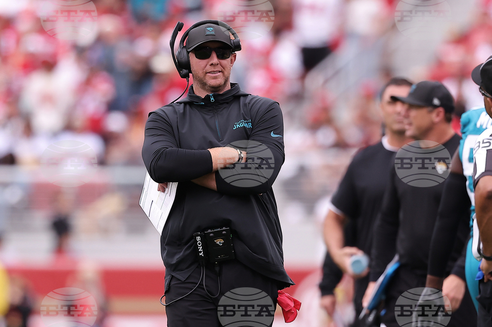 Jacksonville Jaguars head coach Liam Coen speaks at a news conference after an NFL football game against the San Francisco 49ers in Santa Clara, Calif., Sunday, Sept. 28, 2025. (AP Photo/Kelley L. Cox)