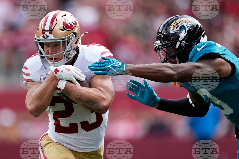 San Francisco 49ers running back Christian McCaffrey (23) runs against Jacksonville Jaguars cornerback Tyson Campbell during the first half of an NFL football game in Santa Clara, Calif., Sunday, Sept. 28, 2025. (AP Photo/Godofredo A. Vásquez)