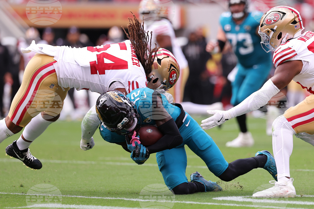 Jacksonville Jaguars defensive tackle Arik Armstead (91) celebrates after sacking San Francisco 49ers quarterback Brock Purdy and forcing a fumble, which the Jaguars recovered, during the second half of an NFL football game in Santa Clara, Calif., Sunday, Sept. 28, 2025. (AP Photo/Kelley L. Cox)