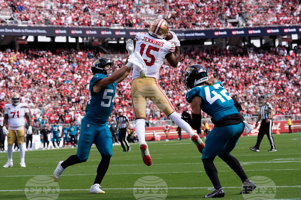 San Francisco 49ers wide receiver Jauan Jennings (15) catches a pass against Jacksonville Jaguars cornerback Tyson Campbell (3) and cornerback Jourdan Lewis during the second half of an NFL football game in Santa Clara, Calif., Sunday, Sept. 28, 2025. (AP Photo/Godofredo A. Vásquez)