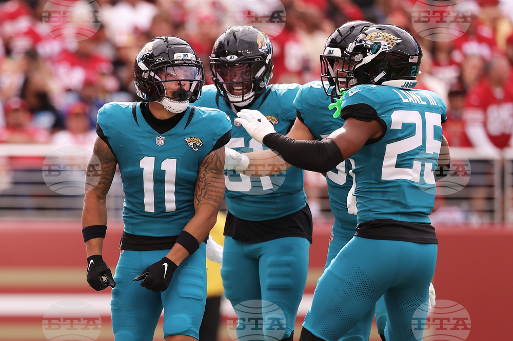 Jacksonville Jaguars linebacker Devin Lloyd, right, is congratulated by safety Antonio Johnson after intercepting a pass against the San Francisco 49ers during the first half of an NFL football game in Santa Clara, Calif., Sunday, Sept. 28, 2025. (AP Photo/Godofredo A. Vásquez)