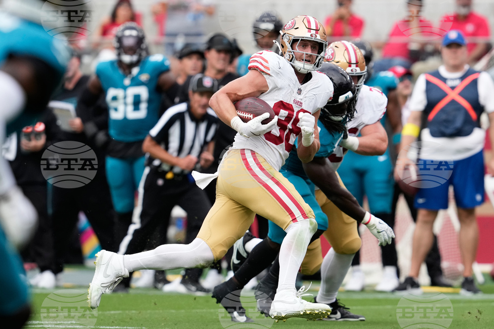 San Francisco 49ers fullback Kyle Juszczyk (44) runs against the Jacksonville Jaguars during the first half of an NFL football game in Santa Clara, Calif., Sunday, Sept. 28, 2025. (AP Photo/Godofredo A. Vásquez)