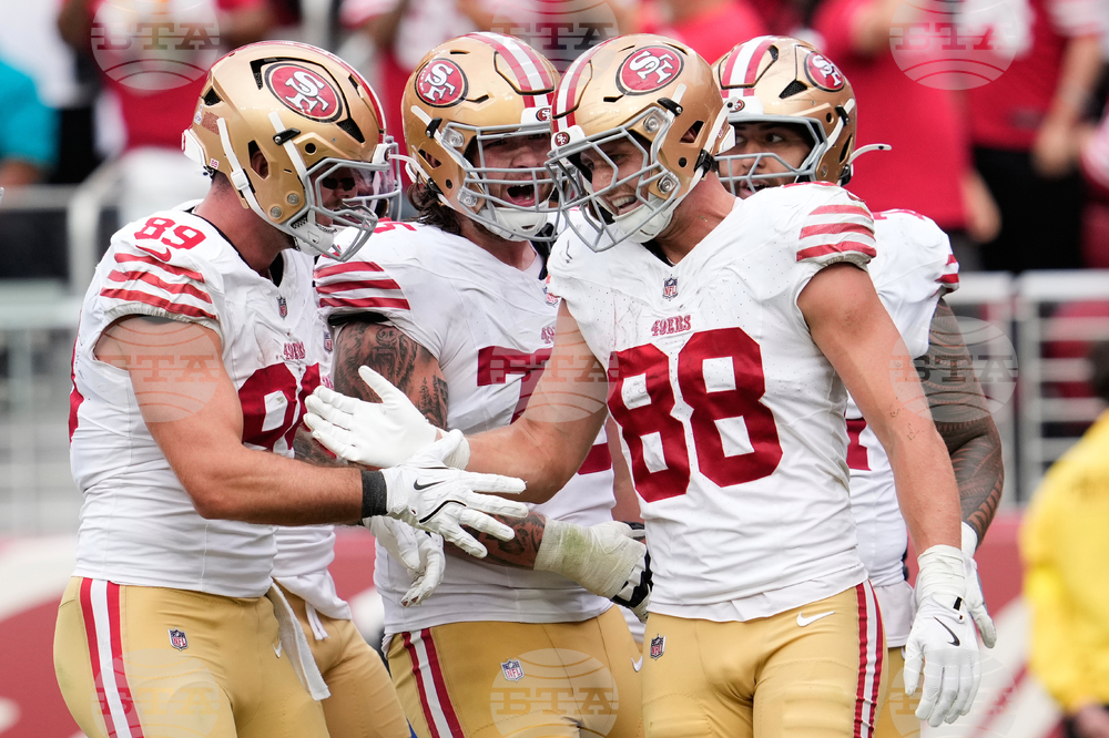 San Francisco 49ers tight end Jake Tonges (88) is congratulated by teammates after scoring against the Jacksonville Jaguars during the second half of an NFL football game in Santa Clara, Calif., Sunday, Sept. 28, 2025. (AP Photo/Godofredo A. Vásquez)